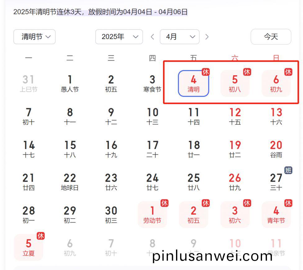 2025年4月4日(星期五)至4月6日(星期日)放假調休,共3天。